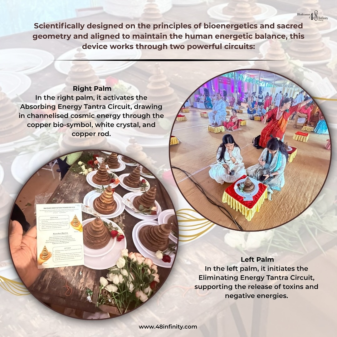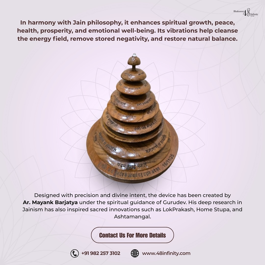 Scientifically designed by Ar. Mayank Barjatya, the device balances energy through sacred geometry—absorbing cosmic energy from the right palm and releasing negativity from the left.